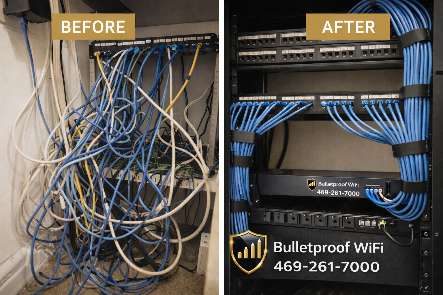 Messy cables can cause network issues and make maintenance harder. Bulletproof WiFi professionally organizes and secures your network cabling and equipment to create a clean, reliable, and easy-to-manage setup for homes and businesses.
